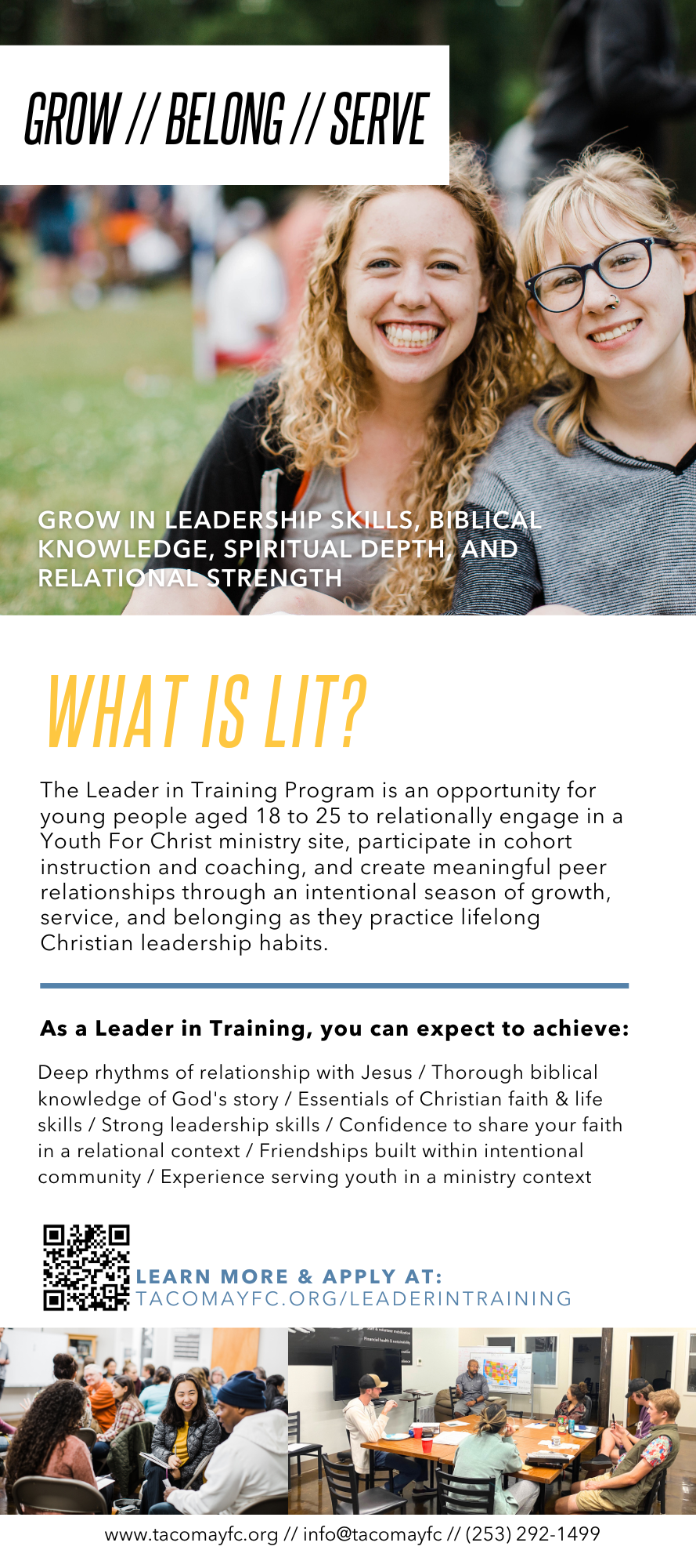 Reverse side of rack card to promote YFC's Leader in Training program. Design, photography, and copy-editing by Erin.